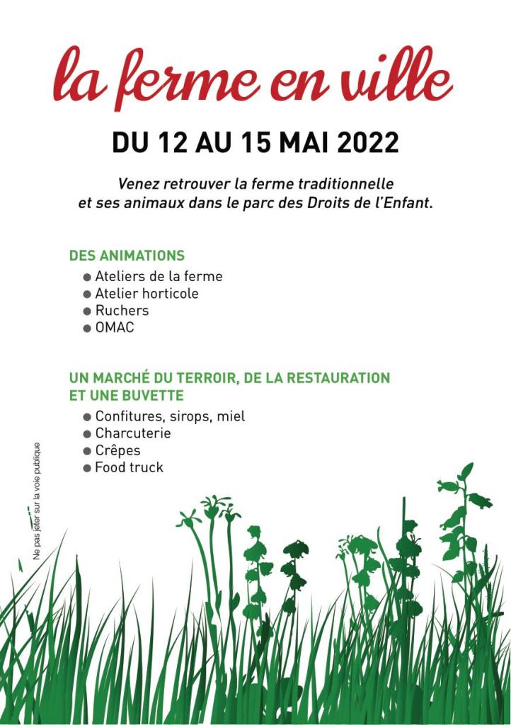 Comme à son habitude, la Ferme en Ville revient s’installer dans le Parc des Droits de l’Enfant pour quatre jours. Animés par les Gens de la Terre cette animation vous proposera des ateliers proches du travail de la nature, des animaux etc… Egalement cette année les enfants auront durant le week-end la possibilité de faire une petite balade en poney. Et bien évidemment comme tous les ans nous vpus attendons nombreux.